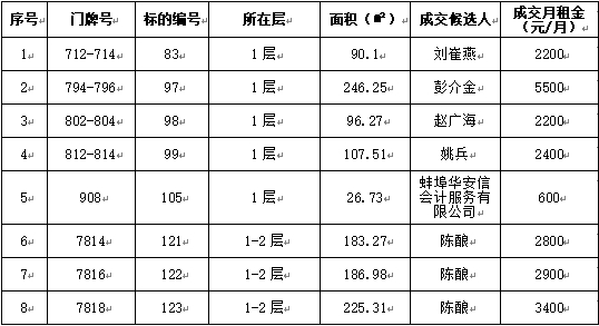 喜迎門小區(qū)部分商鋪公開競價招租工作已經(jīng)結(jié)束,成交候選人已經(jīng)確定。現(xiàn)將競租結(jié)果公示如下: