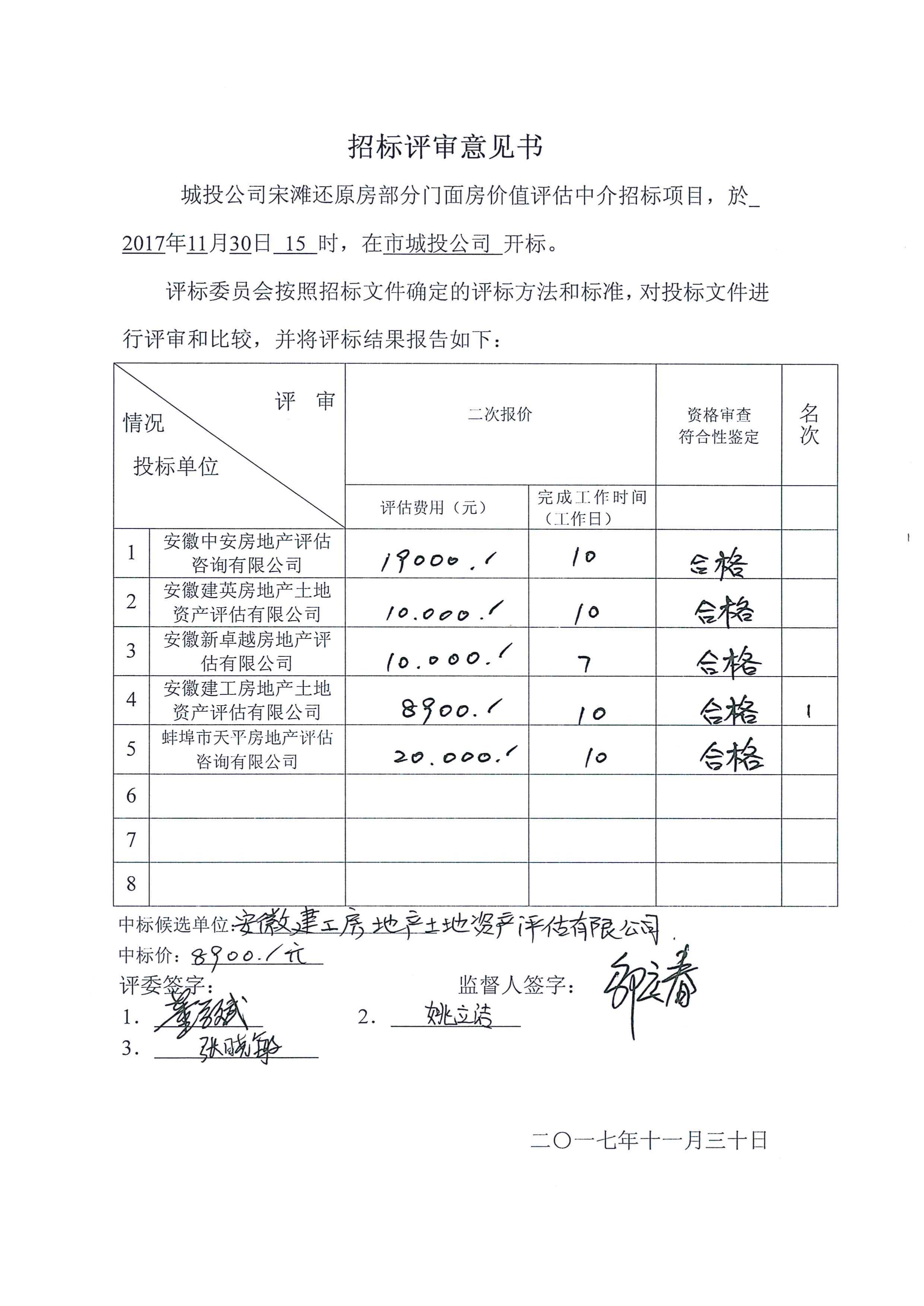 宋灘部分門面房?jī)r(jià)值評(píng)估中介中標(biāo)公示 宋灘還原房部分門面房?jī)r(jià)值評(píng)估中介招標(biāo)項(xiàng)目中標(biāo)候選單位是:安徽建工房地產(chǎn)土地資產(chǎn)評(píng)估有限公司。 打印本頁(yè) 關(guān)閉窗口