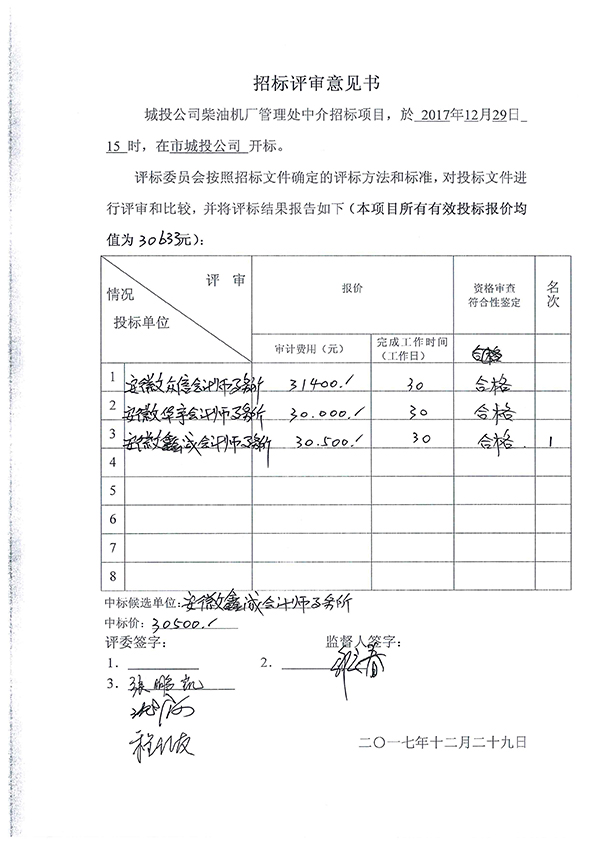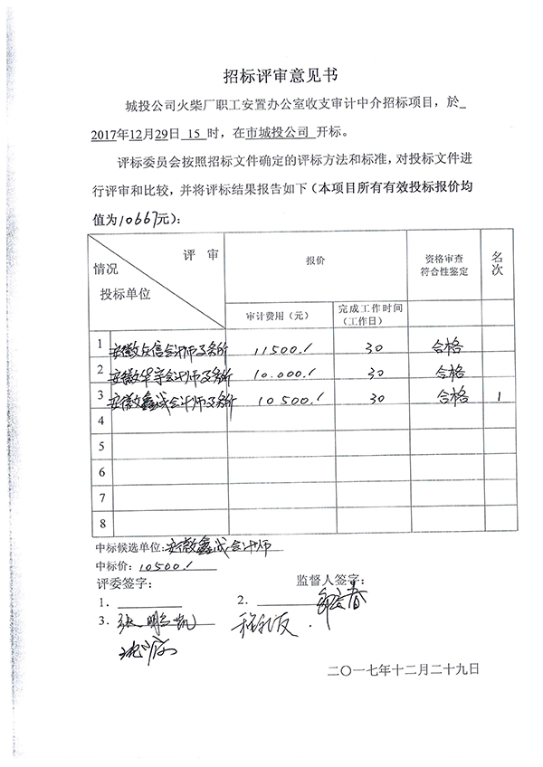 柴油機(jī)廠管理處收支審計、火柴廠職工安置辦公室收支審計中介機(jī)構(gòu)招標(biāo)項目中標(biāo)公示 柴油機(jī)廠管理處收支審計、火柴廠職工安置辦公室收支審計中介機(jī)構(gòu)招標(biāo)項目中標(biāo)候選單位是:安徽鑫誠會計師事務(wù)所。 打印本頁 關(guān)閉窗口