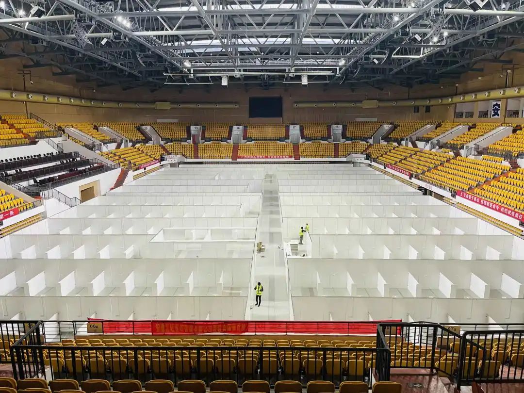 項目主體利用蚌埠體育中心的籃球館、擊劍館、拳擊館和訓練館共4個場館改建。 ★其中,籃球場占地面積最大,改造后能容納426張床位。 ★隔板已安裝到位,偌大的籃球場被分隔成蜂巢一樣整齊劃一的房間。 ★每個隔斷2.1米見方,‘標配’是一張0.9米寬的單人床,一個0.5米寬...