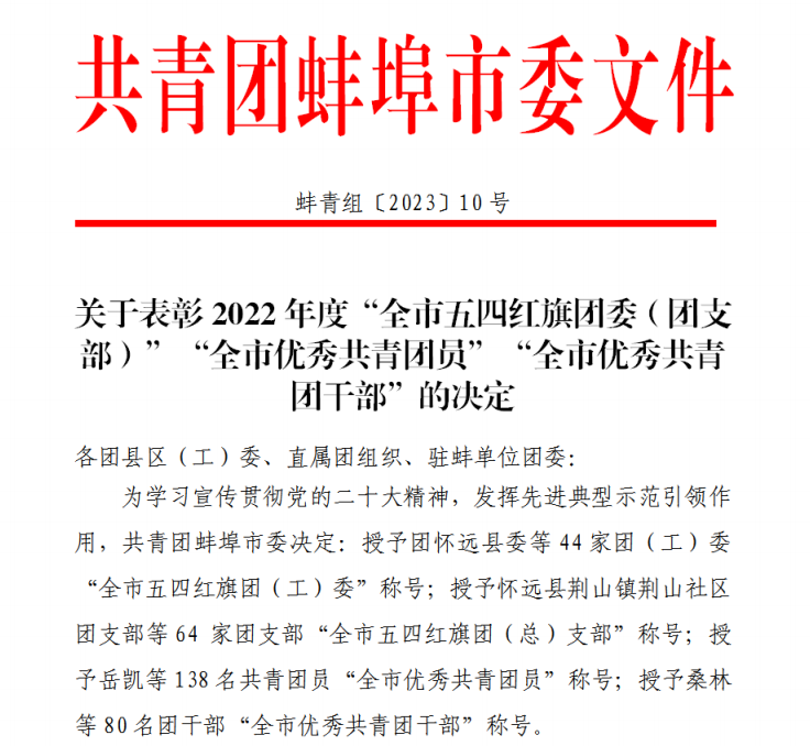 近日,共青團(tuán)蚌埠市委發(fā)布《關(guān)于表彰2022年度“全市五四紅旗團(tuán)委(團(tuán)支部) ”“全市優(yōu)秀共青團(tuán)員”“全市優(yōu)秀共青團(tuán)干部”的決定》,授予市城投公司團(tuán)支部2022年度“全市五四紅旗團(tuán)支部”稱號(hào),城投公司原團(tuán)工委書記、工程部部長(zhǎng)蔣文超同志2022年度“全市優(yōu)秀共青團(tuán)干部”稱號(hào),城投智慧停車公司員工張錦秋同志2022年度“全市優(yōu)秀共青團(tuán)員”稱號(hào)。
