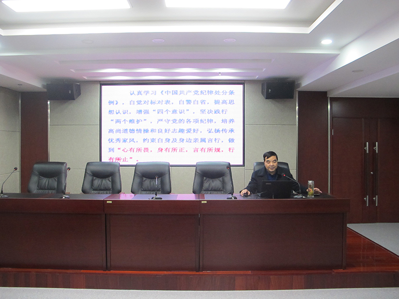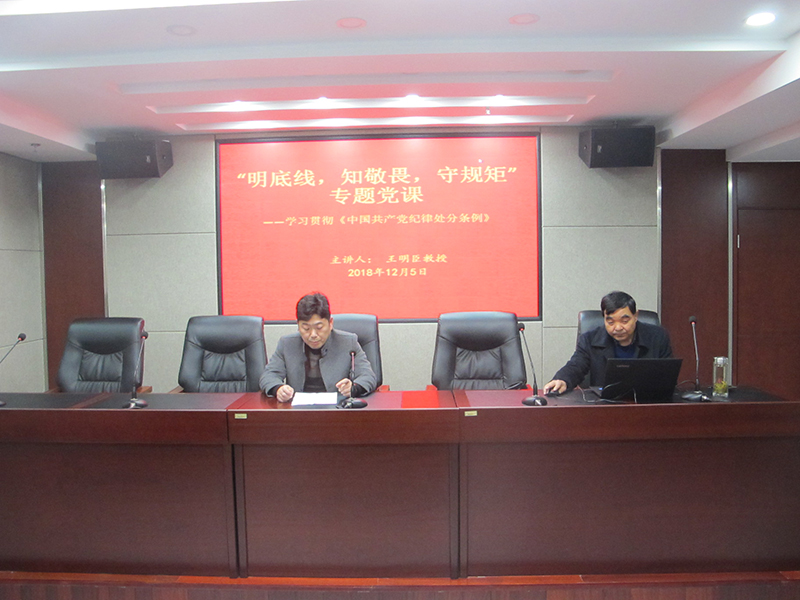 會上,王明臣教授講述了《中國共產黨紀律處分條例》修訂情況及意義,對最新出臺的《中國共產黨紀律處分條例》進行了詳細地闡述和分析,以“一、二、三、四、五、六、七、八”即“一個思想、兩個堅決維護、三個重點、四個意識、四個形態、五處紀法銜接、六個從嚴、七個有之、八種典型違紀行為”,言簡意賅地概述了《中國共產黨紀律處分條例》的特點,切實讓全體黨員對《中國共產黨紀律處分條例》有了更加深刻的認識和了解。同時,王明臣教授利用身邊反面典型警醒全體黨員要時刻以《中國共產黨紀律處分條例》為準繩,嚴守黨的紀律規矩,并向全體黨員提出了“謹言慎行、潔身自好”八個字的要求,進一步提升了全體黨員紀律意識。